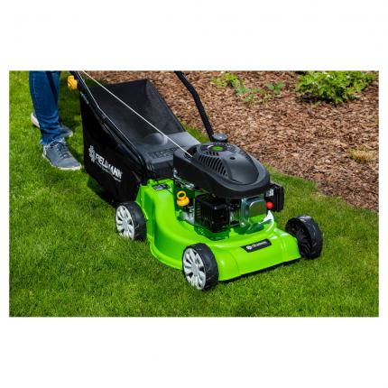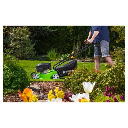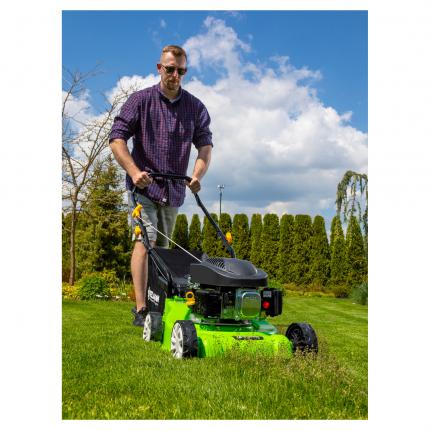 Benzínovou sekačku oceníte především na zahradách a pozemcích, které nejsou připojené k elektrické síti. Jednoduše se ovládají a odpadají starosti s hledáním zásuvky, omezenou mobilitou nebo dokonce přeseknutím kabelu. Motor OHV 79 cm³ s výkonem 1,3 kW si hravě poradí s trávníky o rozloze až 650 m². Pracovní záběr je 40 cm a výška sečení je nastavitelná na 3 pozice, sami si tedy zvolíte nejvhodnější délku trávníku.